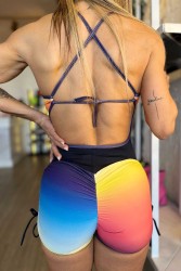 Get ready to make a bold fashion statement with our vibrant and energetic multicolored romper! This playful piece features a stunning array of shades, including vivid blues, vibrant yellows, fiery reds, and captivating oranges. With its eye-catching design and lively color palette, this romper is the perfect choice for those who love to embrace their unique style. The romper boasts an open back, adding a touch of allure and sophistication to your look. Plus, the strategically placed openings over and under the bust create a flattering silhouette that accentuates your curves in all the right places.