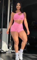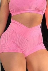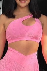 Features: A set of pants and crop top with details, both in pink.