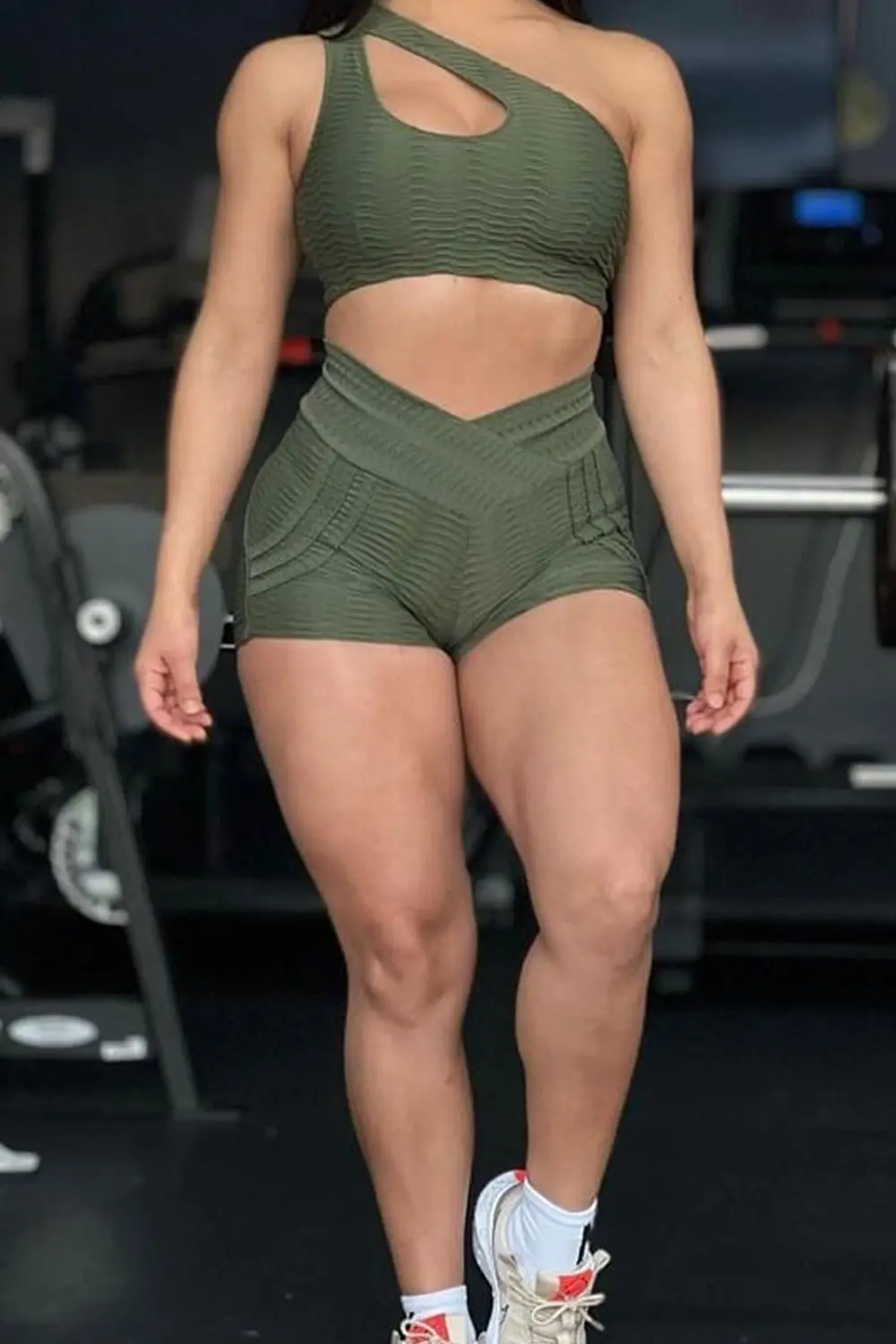 Get ready to turn heads in this stunning green fitness set! Crafted from cutting-edge 3D texturized polyamide fabric, it's not just workout wear; it's a fashion statement. The asymmetric sleeveless cropped top offers a unique twist to your activewear, and the shorts, adorned with decorative straps on the sides, are the perfect blend of style and functionality.