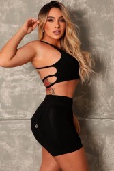 Black fitness set featuring a top with crisscross straps and side cutouts, accentuating your curves with style and support. The shorts shape the body with a high waist and functional back pockets, combining practicality and sophistication for your workouts or casual looks. Ideal for those seeking performance with a modern design.