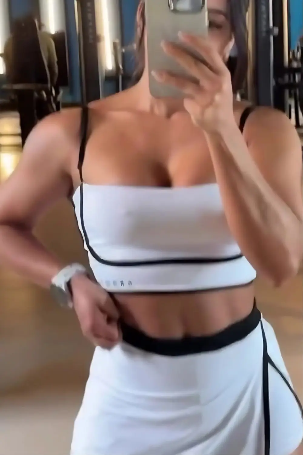 This two-piece set, ideal for working out, consists of a white top and short skirt with black accents. The top features thin straps and a straight neckline, with a black band circling the hem and neckline, providing support and style.
