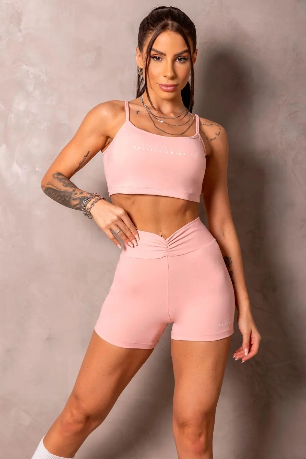 Pink top with a fitted fit and a soft feel, ensuring support and comfort. The shorts feature a draped detail on the front, highlighting the waist and adding a delicate charm to the fitness look.