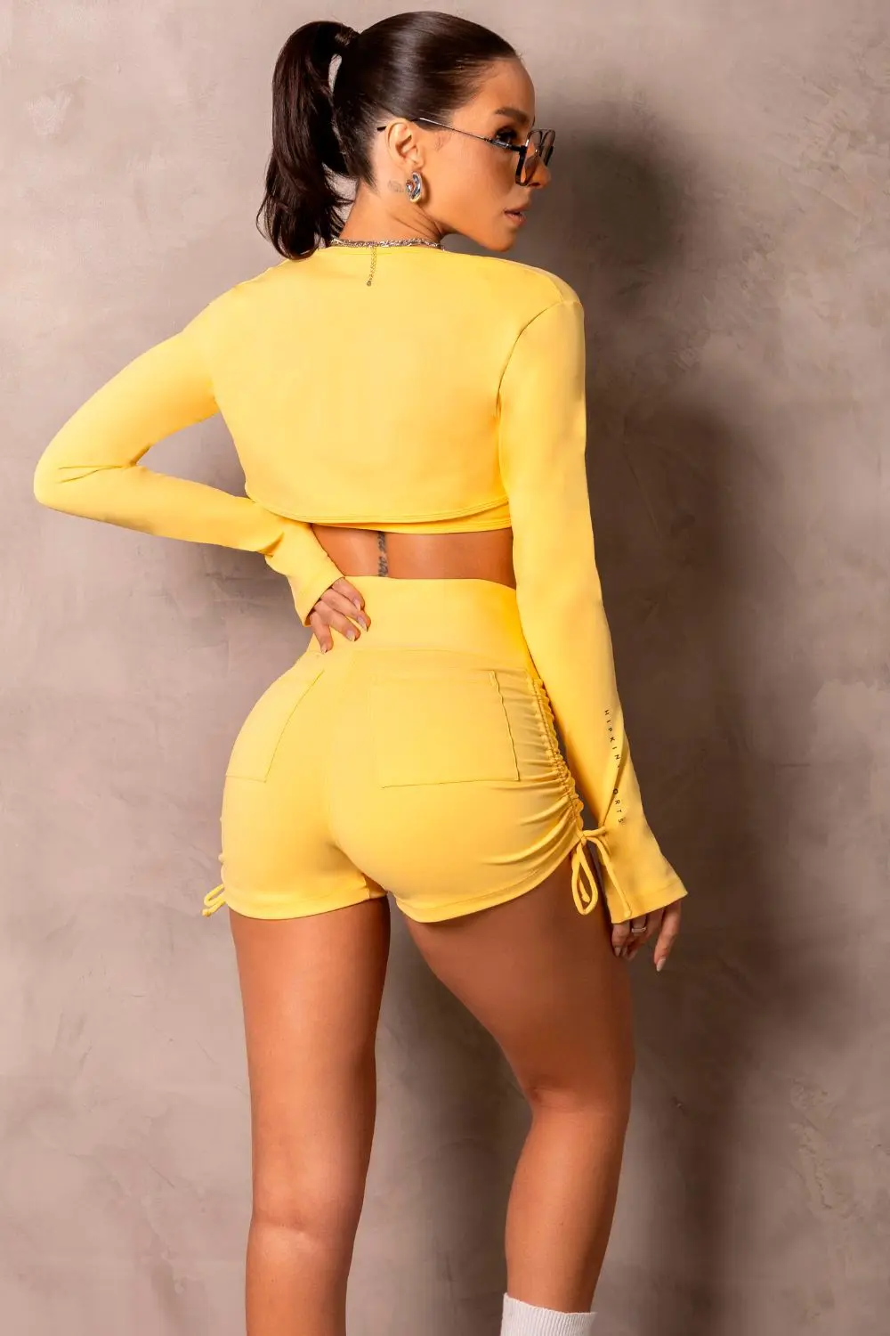 Yellow fitness shorts with a high waistband, functional back pockets, high-performance fabric, and a silhouette-enhancing design. Perfect for practical and stylish workouts.