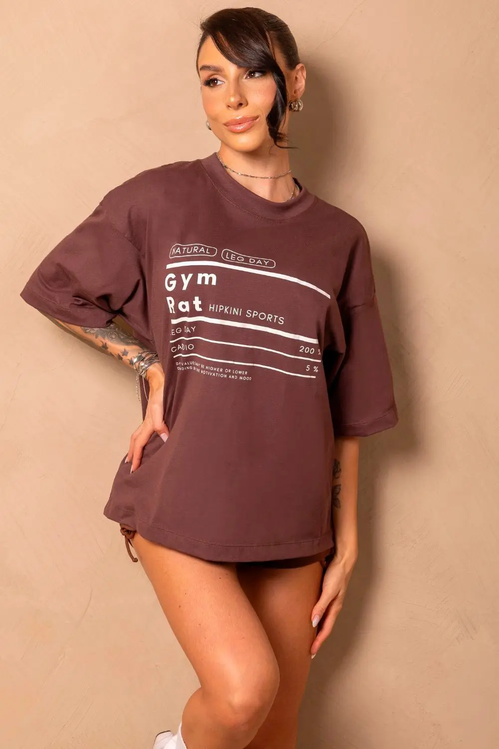 Brown T-shirt with "Gym Rat" print on the front. Loose and comfortable, ideal for casual or sporty looks with a modern style.