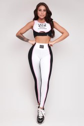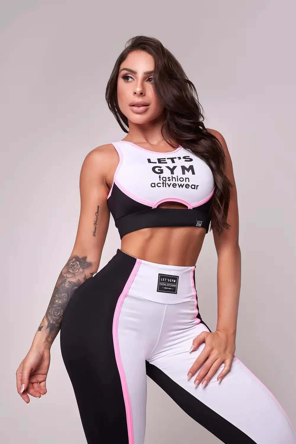 Two-tone fitness top with pink details. The high-waisted leggings shape the silhouette, while the top with front print and openwork cutout ensures style and support. Perfect for rocking your workouts!