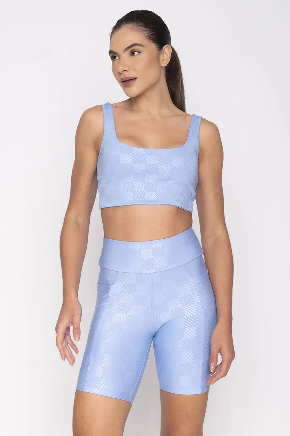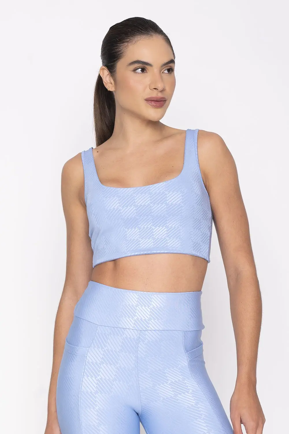 Light blue top with wide straps and a square neckline. The fabric has a subtle pattern that gives a distinctive and modern touch to the look, in addition to offering support and comfort for physical activities. The back is open and has a twisted detail that adds much more charm.