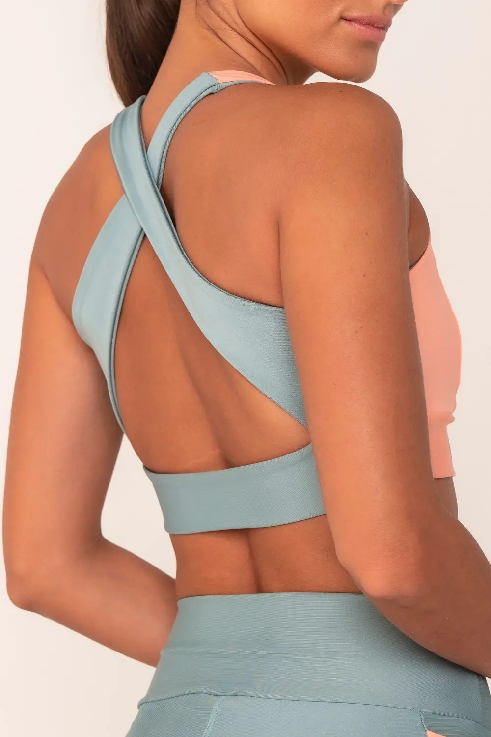 Modern and comfortable sports bra, ideal for various physical activities. It has an elegant design with peach and blue-gray details, as well as a discreet logo. It offers good support and freedom of movement. The back has a distinctive design with crossed straps in blue-gray, complementing the look of the piece.