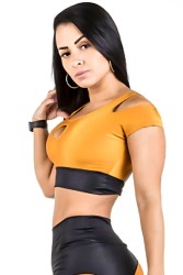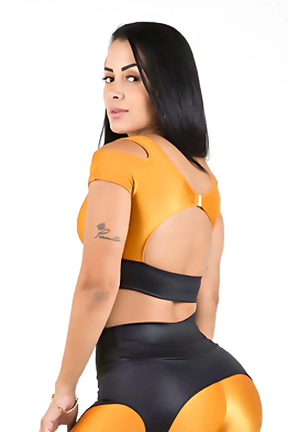 Cropped top with strategic cutouts and a modern design. It features wide straps with exposed shoulders, a rounded front neckline, and an asymmetrical back cutout that flatters the back. The contrasting black fabric underband provides stylish support. Ideal for those seeking a bold and sophisticated look in fitness fashion.