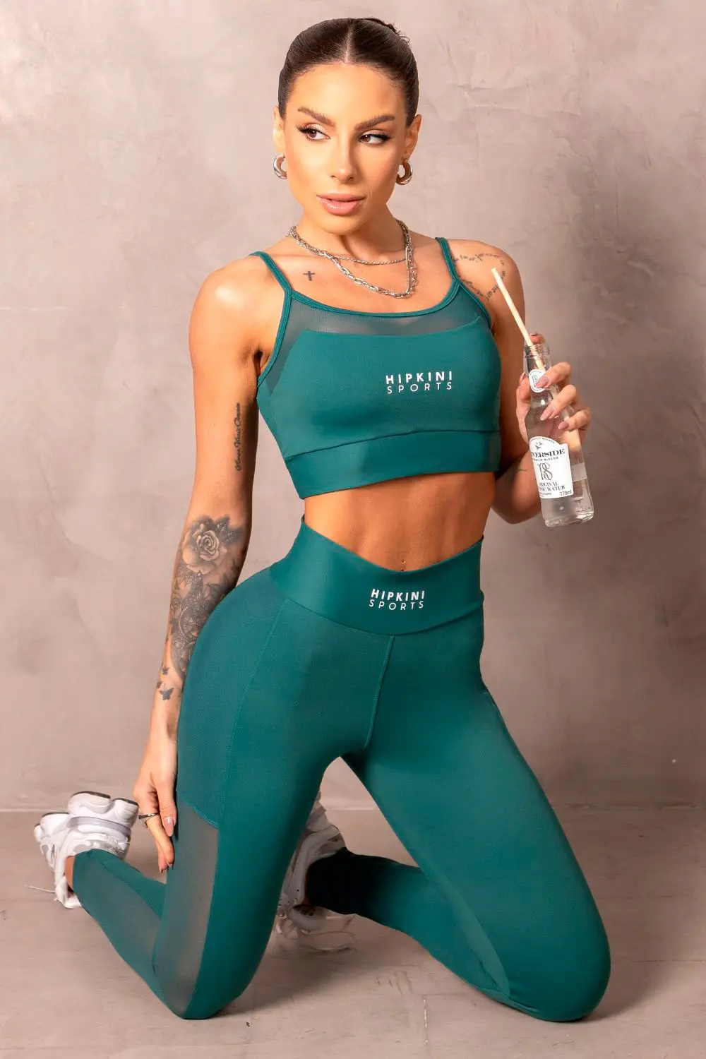 Dark green sports bra with tulle detailing on the front and adjustable thin straps. It offers comfortable support, anatomical fit, and high-compression fabric. Ideal for intense workouts in style.
