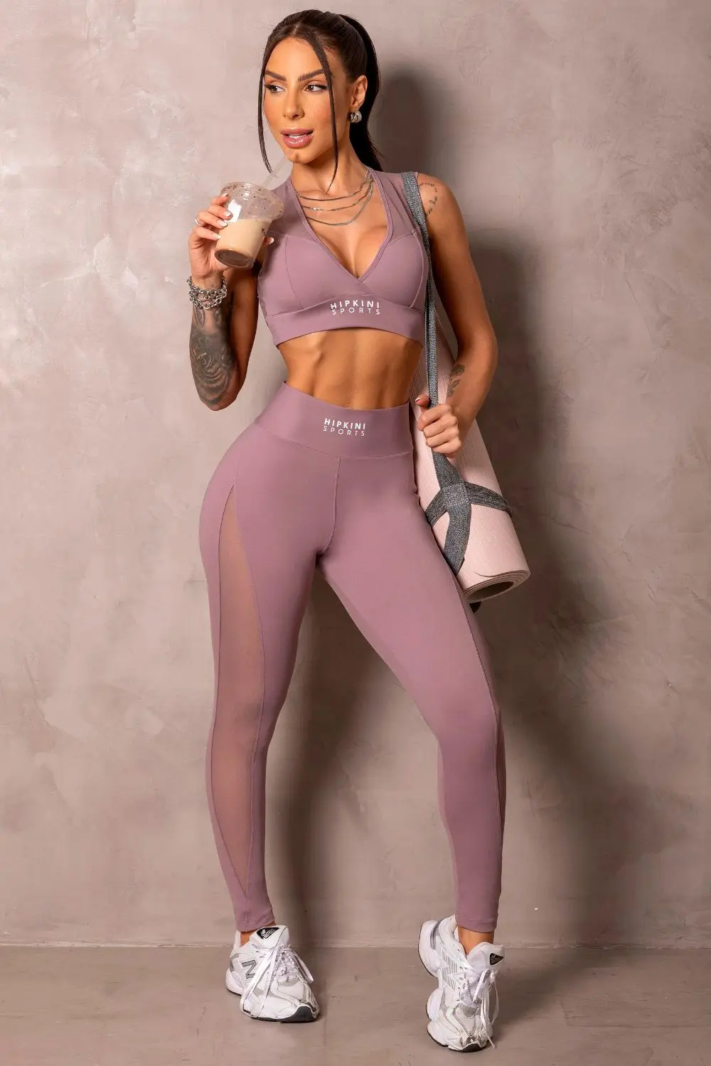 This Old Rose fitness top with a V-neckline and wide straps provides support and style. It features a tulle detail on the back that enhances the design and offers greater breathability. Ideal for workouts and casual wear. The "Hipkini Sports" logo is centered on the bust.