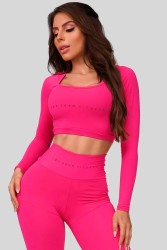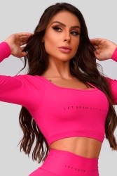 Cropped top with padding in high-compression, stretch fabric, ideal for workouts and physical activities. It features long sleeves, a fitted design, and a square neckline that accentuates the bust. A subtle "LET'S GYM FITNESS" print in the center. Perfect for those seeking style and performance at the gym.