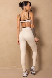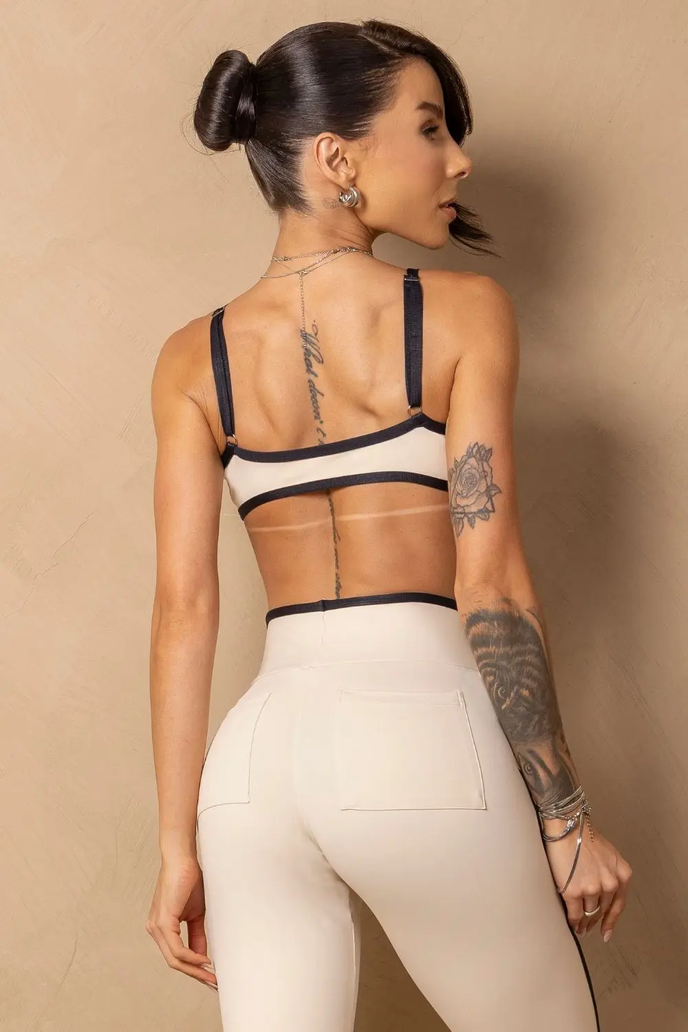 Cream top with thin straps and black piping, highlighting the modern design. It features a rubberized front label with the logo, adding a sporty touch. Made of high-compression fabric, it ensures a perfect fit, comfort, and support.
