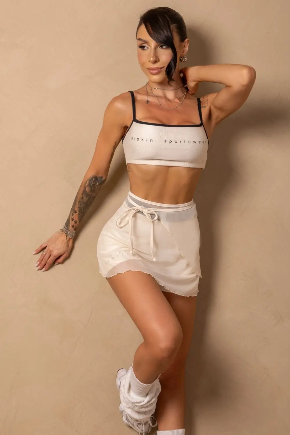 Cream top with thin straps and black piping, highlighting the elegant contrast. It features a "Hipkini Sportswear" print on the front and a fitted fit that flatters the figure. Made from a lightweight, comfortable fabric, it offers support and style for workouts or casual outfits.
