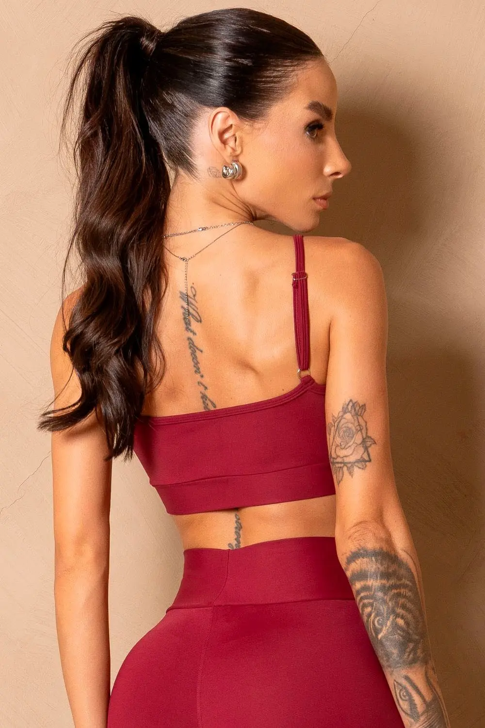 Wine-colored top with double fabric, thin adjustable straps for a personalized fit, and elastic at the hem for added security. Offers support, comfort, and excellent body adaptation, ideal for moving freely and securely.