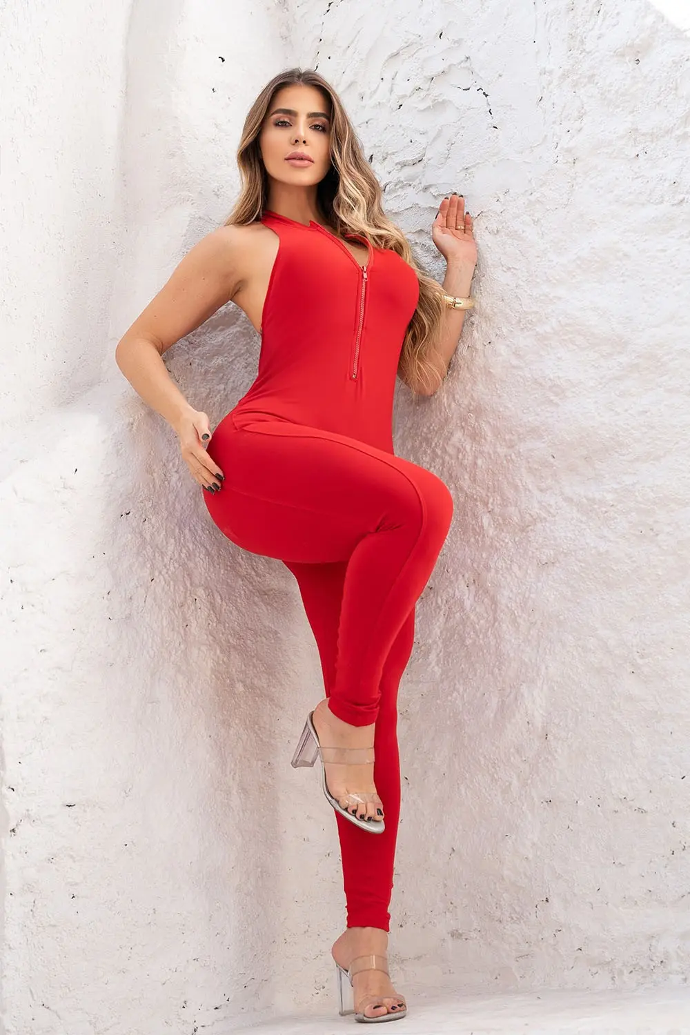 Characteristics: A red fitness jumpsuit with no sleeves, thick shoulder straps, an open back design, and a frontal zipper under the neckline.
