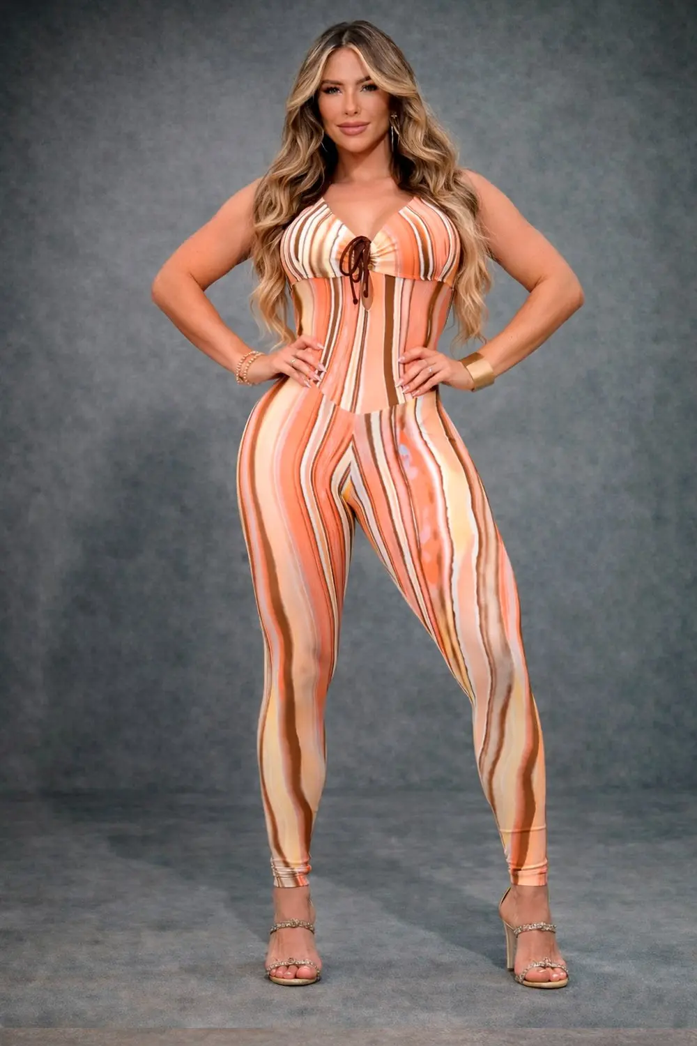 Printed jumpsuit with earth-toned stripes, a fitted cut that flatters the silhouette, and a halter neckline with delicate ties. The open back completes the sophisticated and striking look.