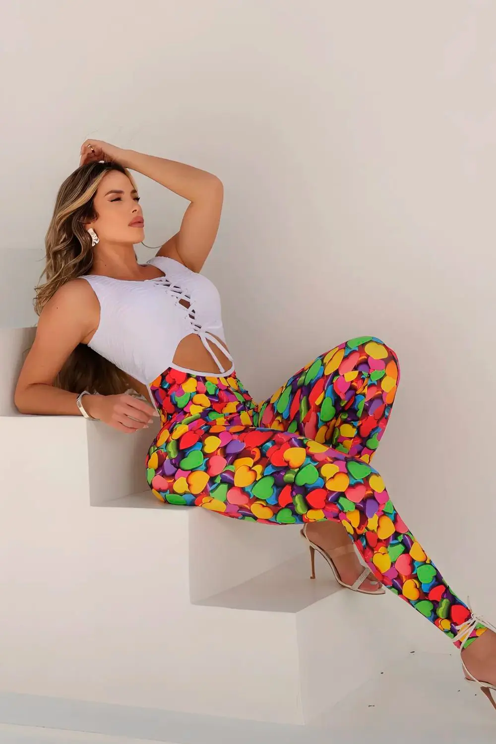 Macacão fitness feminino com design moderno e ousado. Parte superior branca com recortes estratégicos e amarração frontal, além de costas cavadas que valorizam a silhueta. A calça com estampa vibrante de cores coloridas traz um visual divertido e marcante. Ideal para quem busca estilo e conforto durante os treinos ou no dia a dia. Confeccionado com tecido de alta elasticidade que modela o corpo e garante liberdade de movimentos.