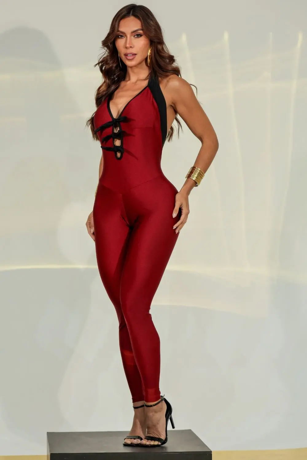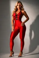 Fitted jumpsuit in soft-touch, highly stretchy fabric, with a cut that flatters curves and ensures comfort. Features a low back, neck tie, and a modern design that combines elegance and sensuality, ideal for events and evening looks.