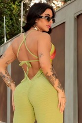 Fitness jumpsuit in high-compression brocade fabric, with an anatomical design that enhances curves and ensures a perfect fit. Features strategic cutouts with a mix of colors, a structured neckline, and an open back with a tie closure, combining support, comfort, and visual impact for workouts and fashionable fitness looks.