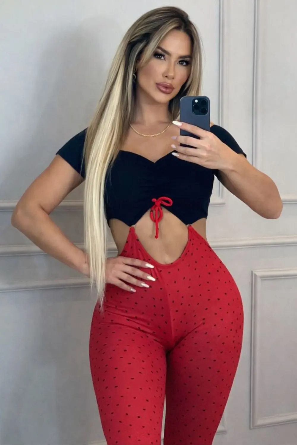 Jumpsuit with an exclusive watermelon-inspired print, made from highly stretchy fabric. Features a fitted legging-style design with central ruching that enhances the buttocks, strategic cutouts, and excellent drape. Side metal rings connect the top to the bottom, highlighting the waist and adding a modern and fashionable touch to the piece, ideal for workouts or stylish fitness outfits.