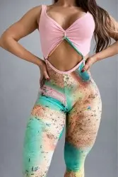 Fitness jumpsuit with a modern design and strategic cutouts that flatter the figure. Features a top with a twisted detail and front opening, providing charm and support. The exclusive print in soft tones offers a sophisticated and contemporary look. Made from highly elastic fabric, it offers comfort, a perfect fit, and freedom of movement for workouts or casual wear.