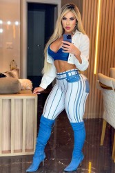 Characteristics: Get ready to strut your stuff in these chic and stylish white jeans leggings with a pop of bold blue stripes! Made from comfortable and stretchy material, these leggings will hug your curves in all the right places while adding a touch of playful flair to your look.