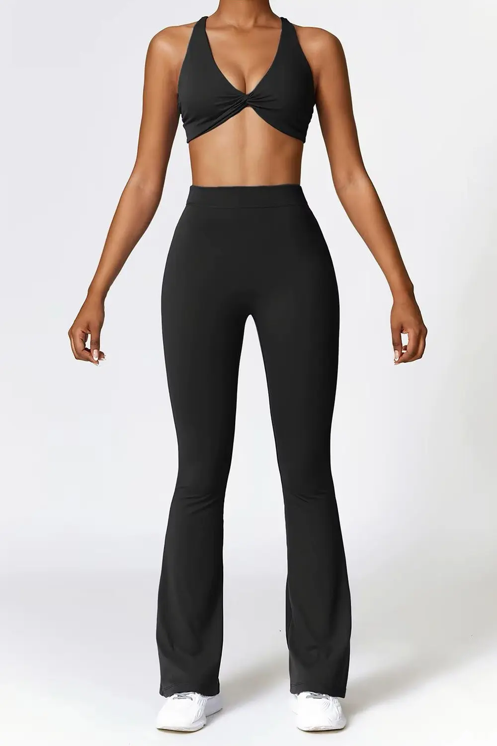 Sports set with a top with crossed straps and twisted detail on the bust, combining support and style. The high-waisted pants shape the body, with a gathered detail on the back and flared hem for an elegant touch. Perfect for workouts and casual looks!