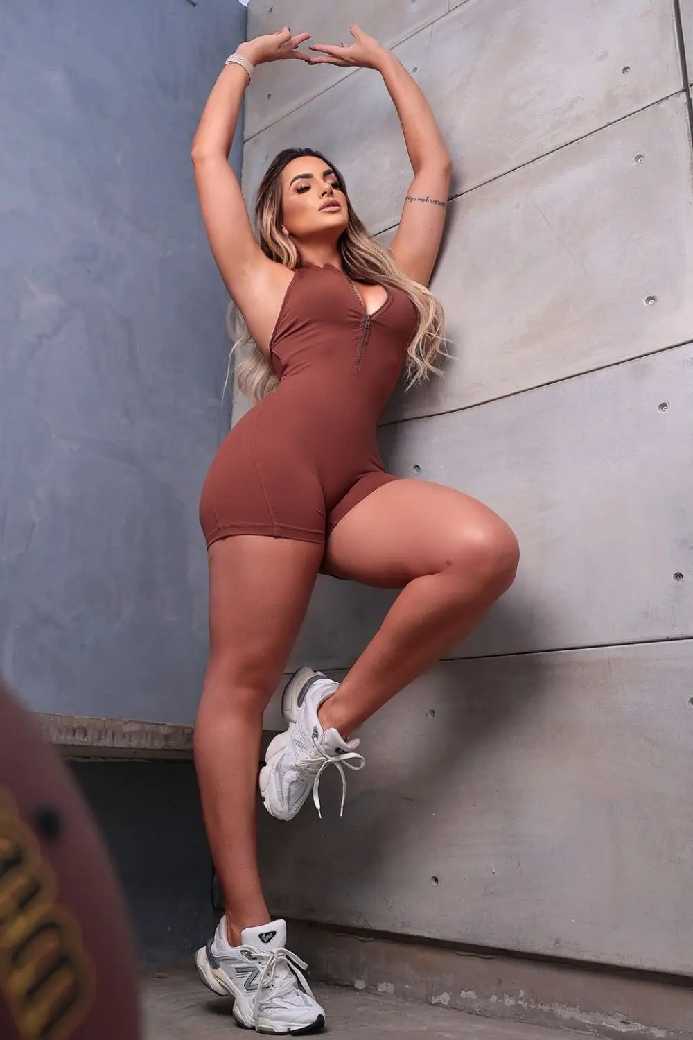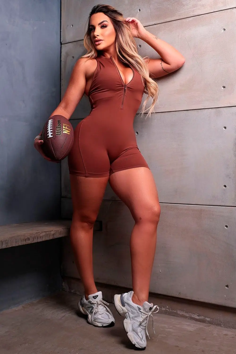 This brown fitness jumpsuit is the perfect choice for those who want practicality and style during their workouts. With a fitted design that flatters your curves, it features a front zipper for a convenient fit and a neckline that accentuates the bust. The lightweight, comfortable fabric provides complete freedom of movement, ensuring you feel amazing while working out. Ideal for weight training, running, or any activity where comfort and confidence are essential!