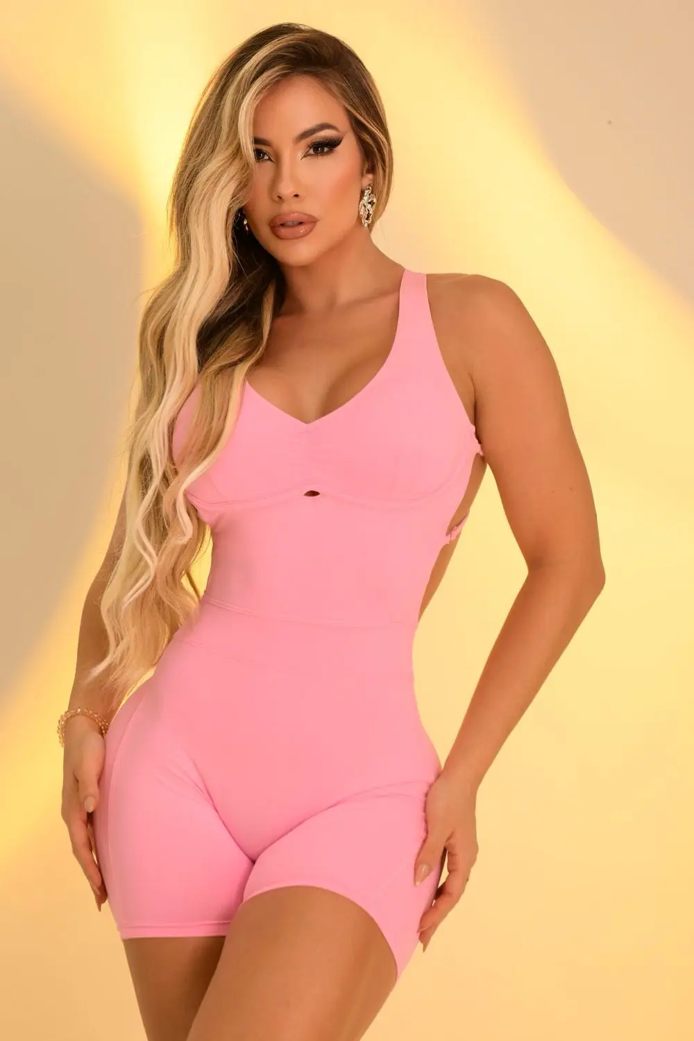 This romper is made from a form-fitting, stretchy fabric that shapes the silhouette. It features a V-neck with discreet ruching at the bust and thin straps that cross at the back, leaving the back almost completely open. The waist is accentuated by the design itself, which elongates and flatters the body shape, creating a minimalist and sophisticated look.