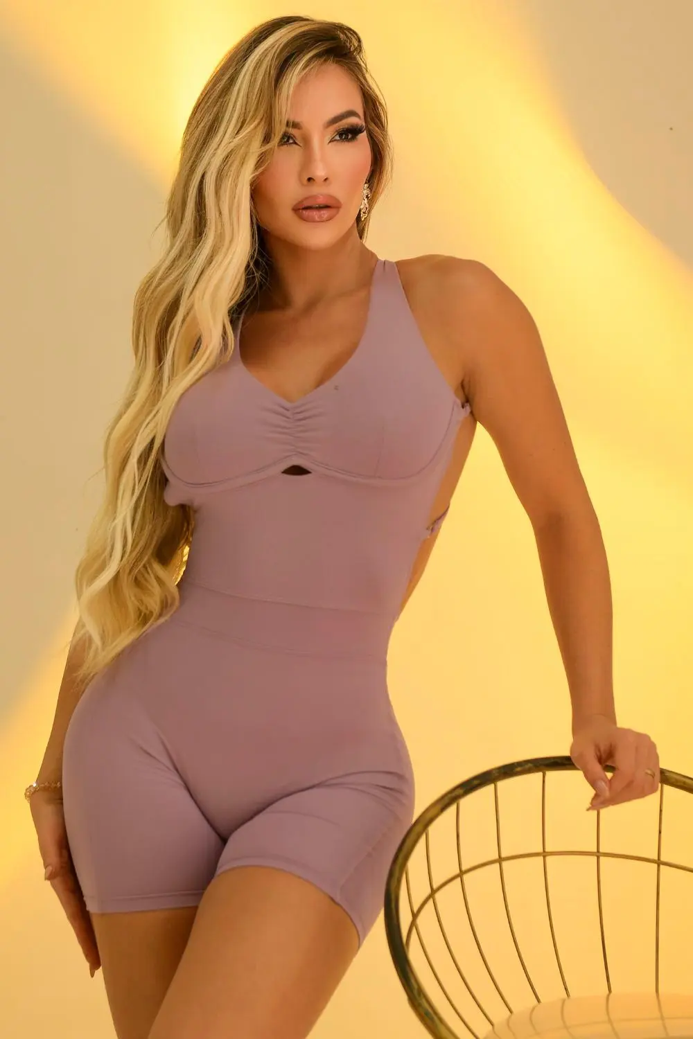 This romper is made from a form-fitting, stretchy fabric that shapes the silhouette. It features a V-neck with discreet ruching at the bust and thin straps that cross at the back, leaving the back almost completely open. The waist is accentuated by the design itself, which elongates and flatters the body shape, creating a minimalist and sophisticated look.