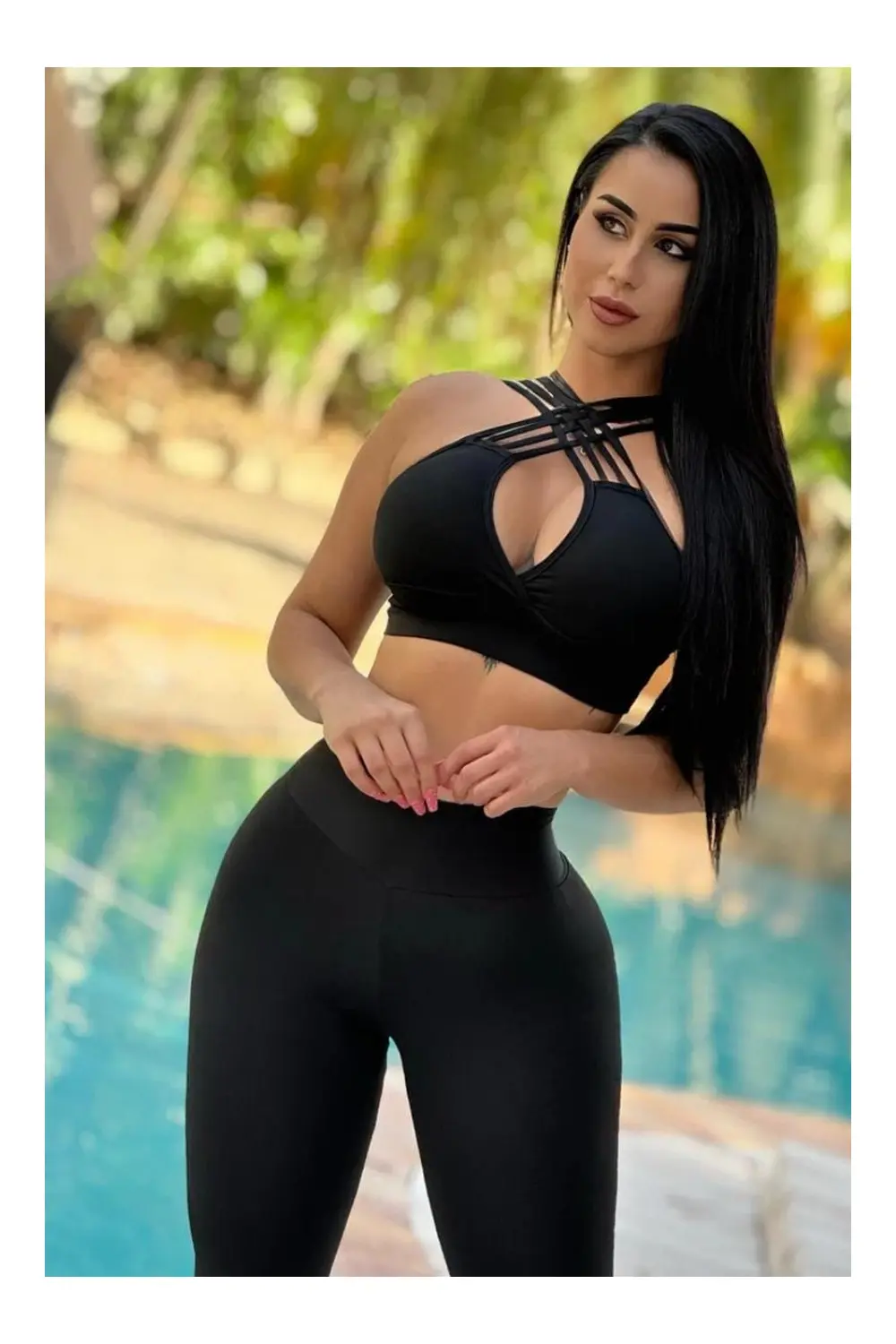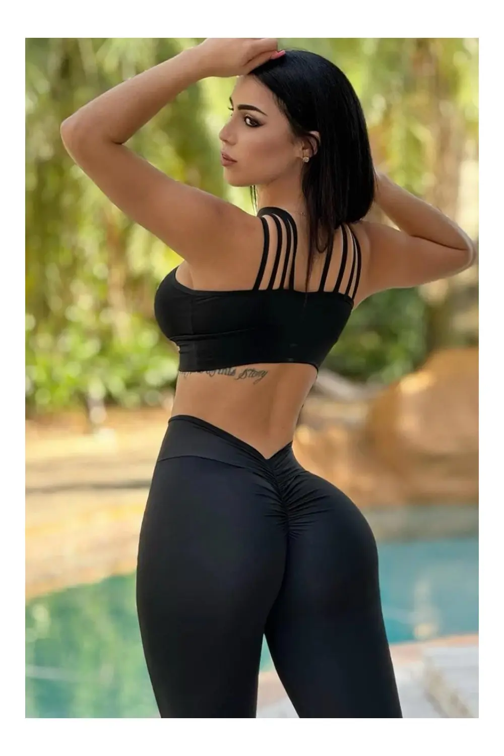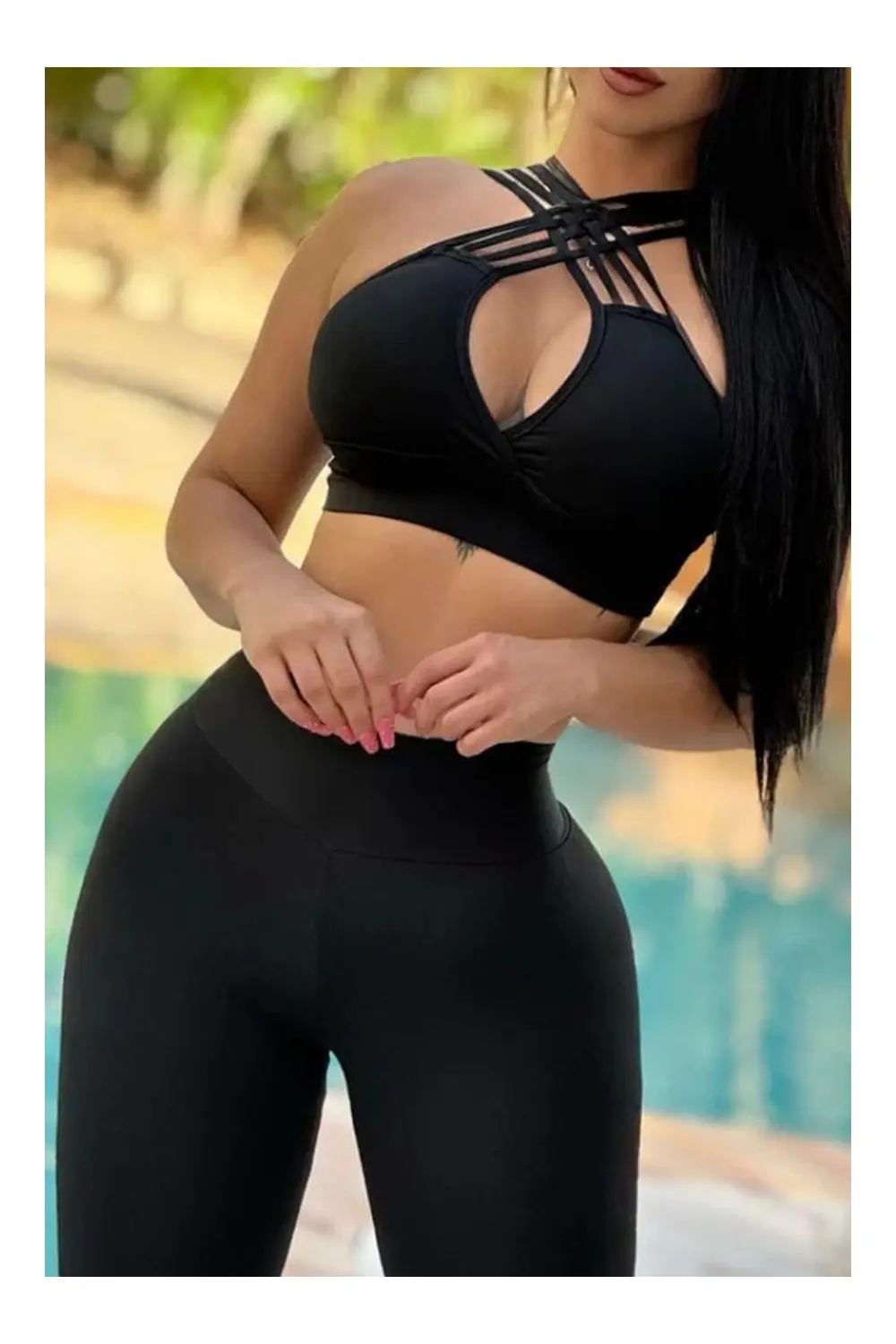 Stand out at the gym in our black fitness set, designed with strategic cutouts to highlight your curves. The butt-lifting pants provide support and shaping, ensuring an elegant and athletic look while you train.